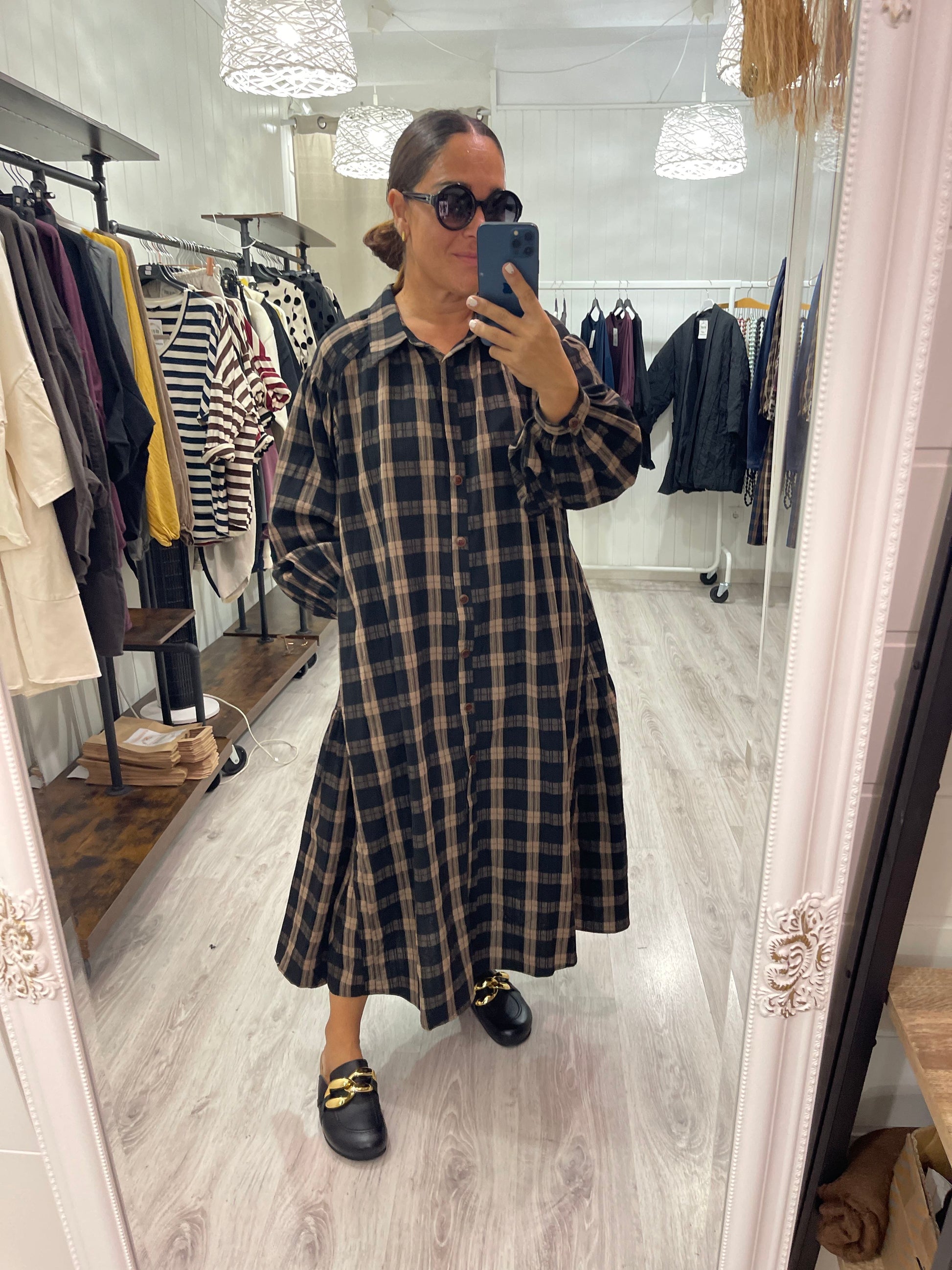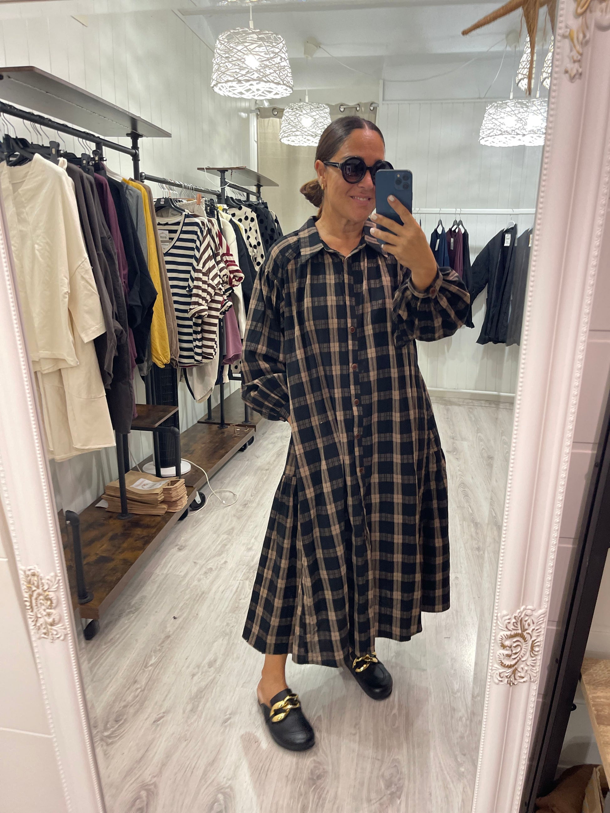 Cuello camisero, manga larga, abotonado al frente con botones, con bolsillos escondidos laterales, y corte ligeramente abombado en caderas.