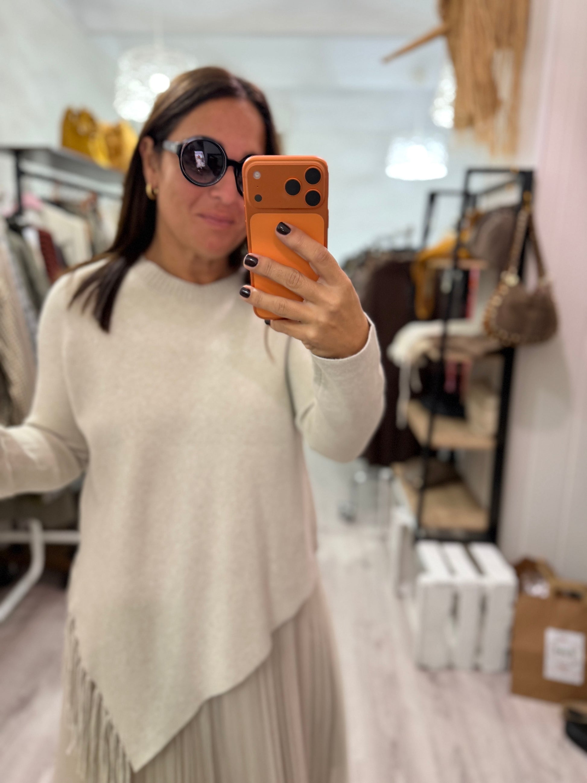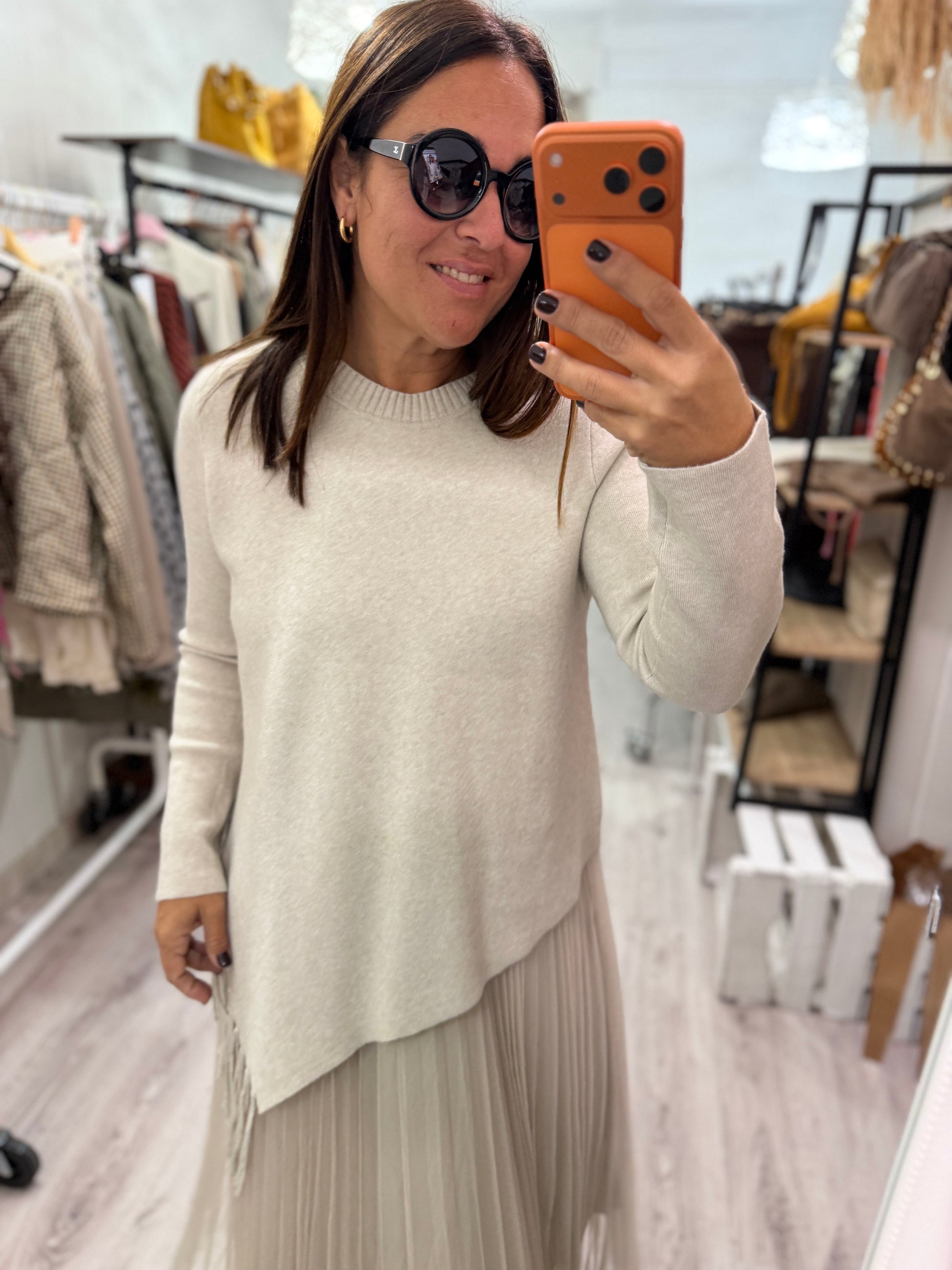 Jersei con cuello redondo, desigual y con flecos en un lateral.